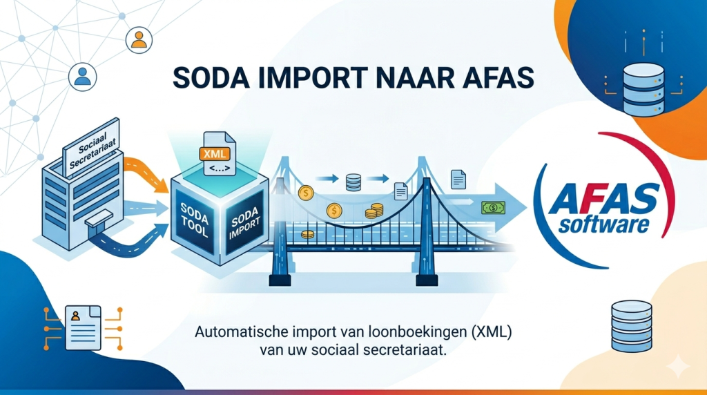 Maak komaf met manuele loonboekingen. Onze SODA import tool automatiseert je maandelijkse loonverwerkingen naar AFAS volledig — snel, foutloos en afgestemd op jouw specifieke werking.